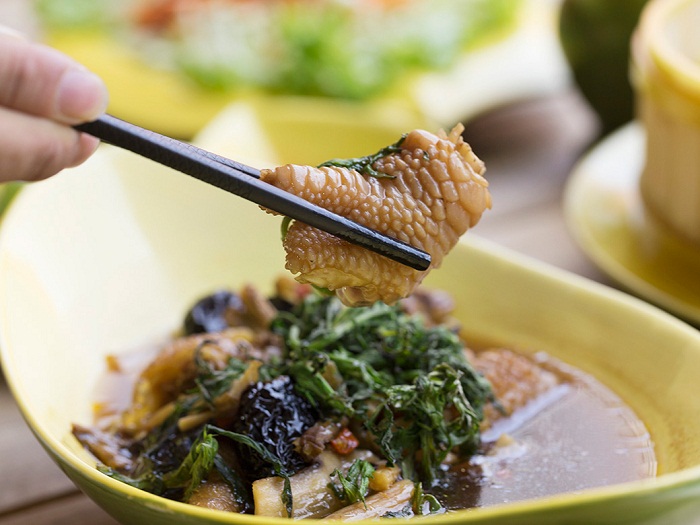 Rất nhiều món ăn được chế biến từ loại gà này như gà luộc, xôi xà, gà nướng,… tuy nhiên, cái hồn của món gà Đông Tảo nằm ở cặp chân. Chân gà hầm thuốc Bắc, cắn một miếng thịt mềm những vẫn giòn sừn sựt chứ không bỡ và béo như chân gà thường.